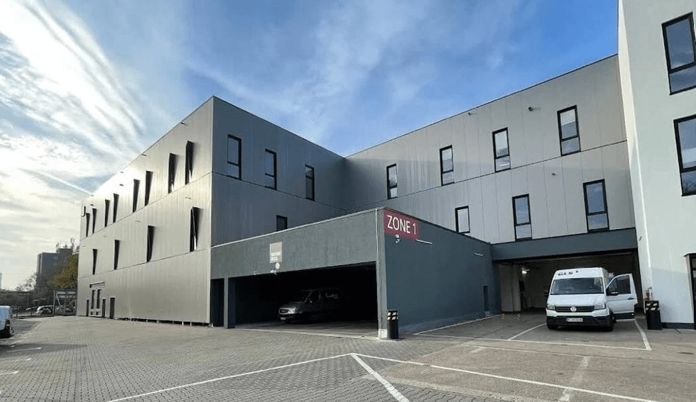 Einfahrt in die Lise-Meitner-Straße 39-41, 10589 Berlin-Charlottenburg auf das Gelände der „PSG Logistic City“.